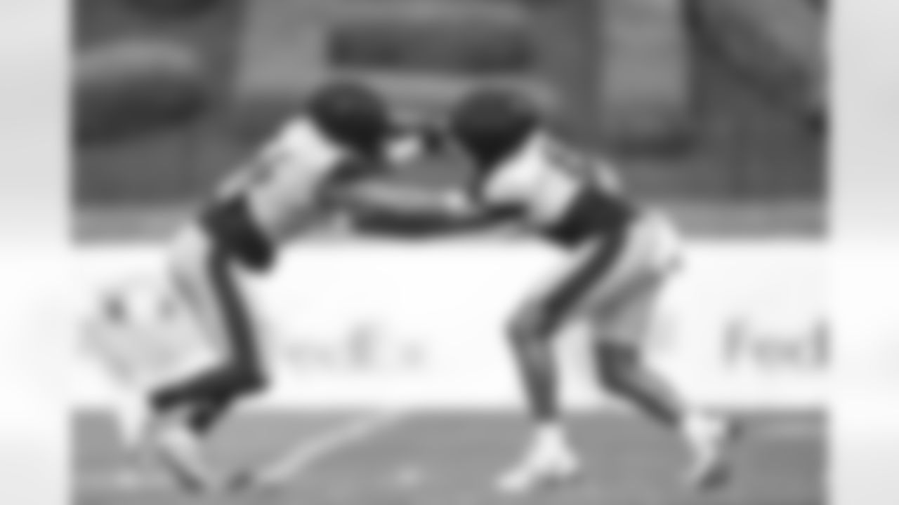 Pittsburgh Steelers linebacker Elandon Roberts (50) and Pittsburgh Steelers running back Anthony McFarland (26) train at Saint Vincent College during the 2023 Steelers Training Camp on Tuesday, Aug. 1, 2023 in Latrobe, PA. (Karl Roser / Pittsburgh Steelers)