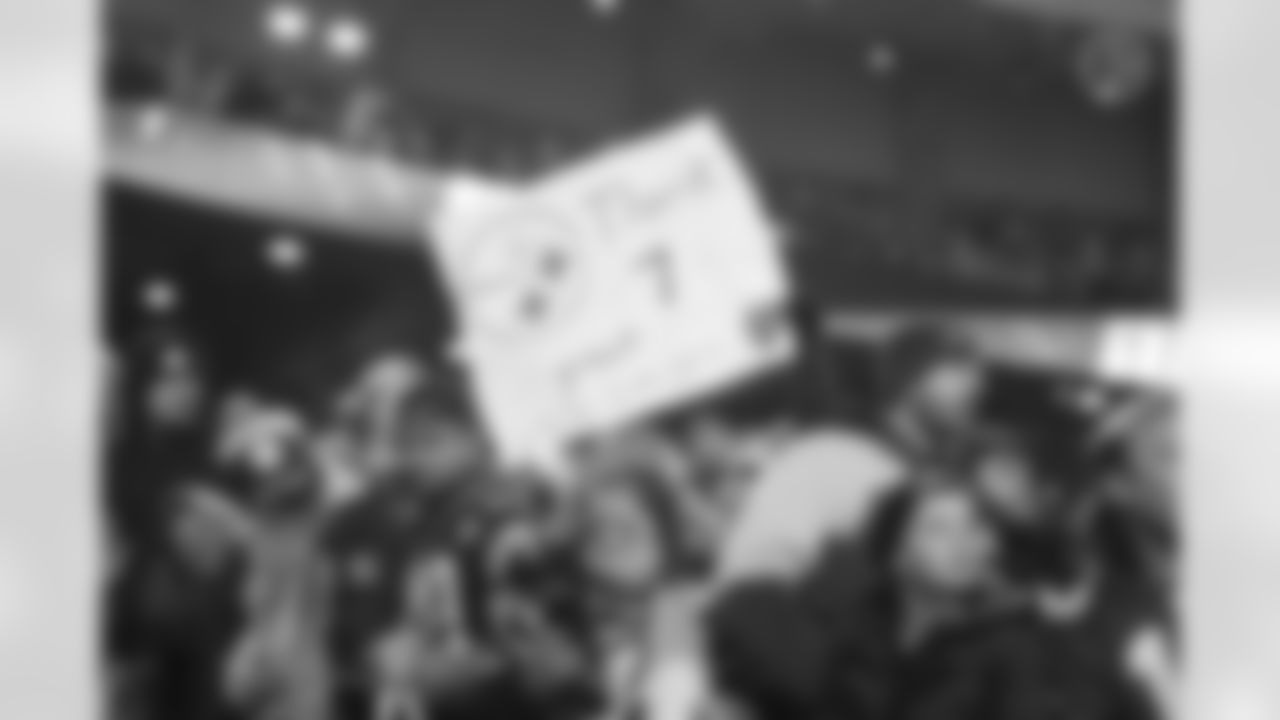 Fans with Pittsburgh Steelers running back Trey Edmunds (33) during a postseason Wild Card Round game between the Pittsburgh Steelers and the Kansas City Chiefs, Sunday, Jan. 16, 2022 in Kansas City, MO. The Steelers lost to the Chiefs 21-42. (Ben Solomon / Pittsburgh Steelers)