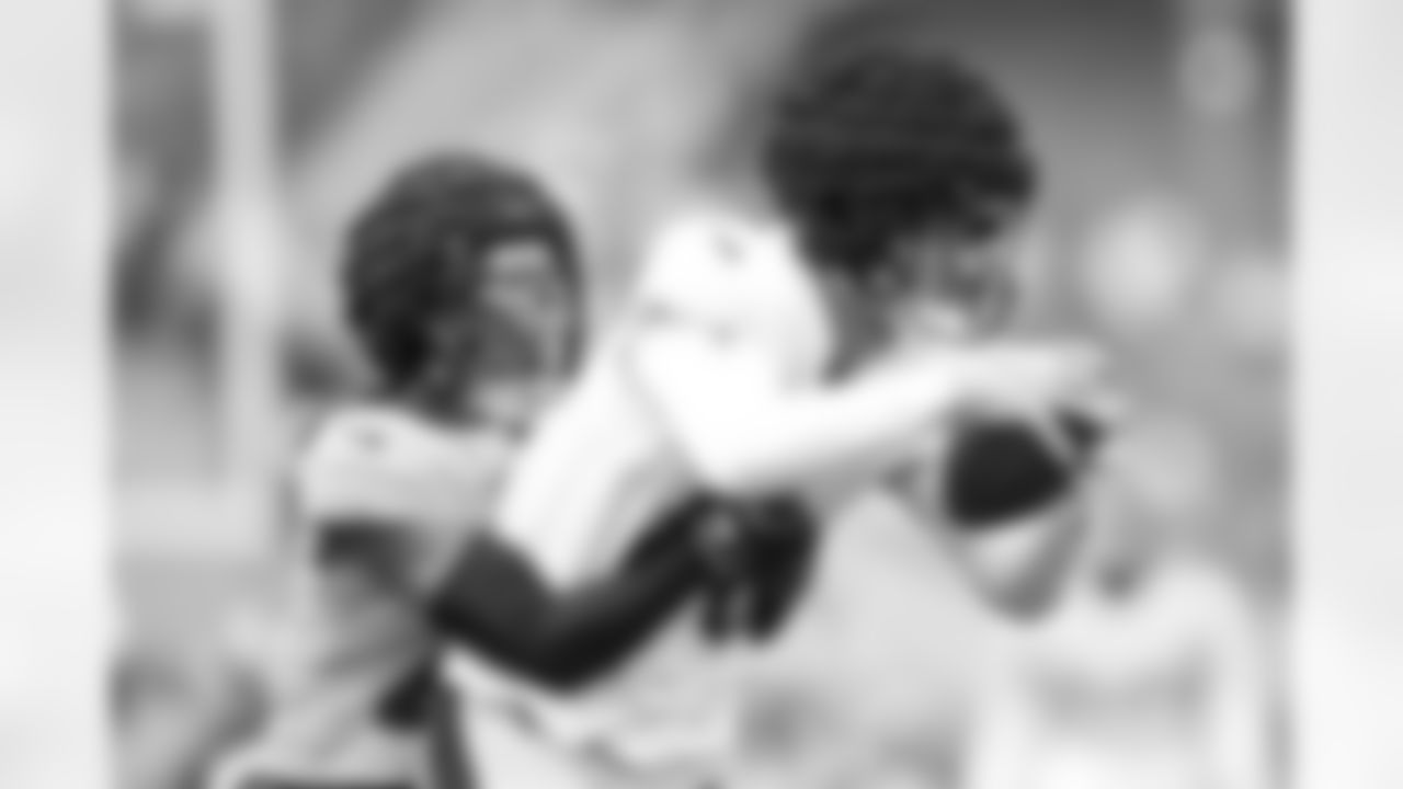 Pittsburgh Steelers safety Minkah Fitzpatrick (39) and Pittsburgh Steelers tight end/fullback Connor Heyward (83) train at Saint Vincent College during the 2022 Steelers Training Camp on Monday, Aug. 15, 2022 in Latrobe, PA. (Abigail Dean / Pittsburgh Steelers)