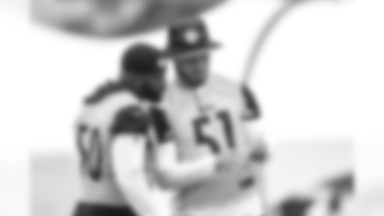 Pittsburgh Steelers linebacker Elandon Roberts (50) and Pittsburgh Steelers linebacker Nick Herbig (51) train at Saint Vincent College during the 2023 Steelers Training Camp on Sunday, Aug. 6, 2023 in Latrobe, PA. (Abigail Dean / Pittsburgh Steelers)